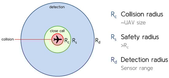 Each obstacle is modeled as a circle with various safety zones, which serve pivotal roles in both collision detection and avoidance simulations, as seen in Figure 7. The collision radius circumscribes the obstacle size, triggering a collision event if the UAV violates this radius. The safety radius specifies the minimum separation distance between the UAV and the obstacle, accounting for deviations and uncertainties during detection and avoidance stages, which trigger a close call event if breached. The detection radius represents the sensor detection range.