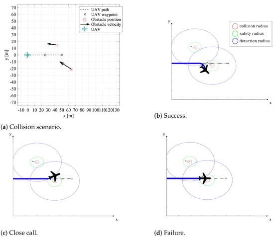 For each potential collision scenario (see its generation in Section 4.1), there are three possible outcomes of the avoidance maneuver, as represented in Figure 8, based on the radii breach: success, close call, and failure.