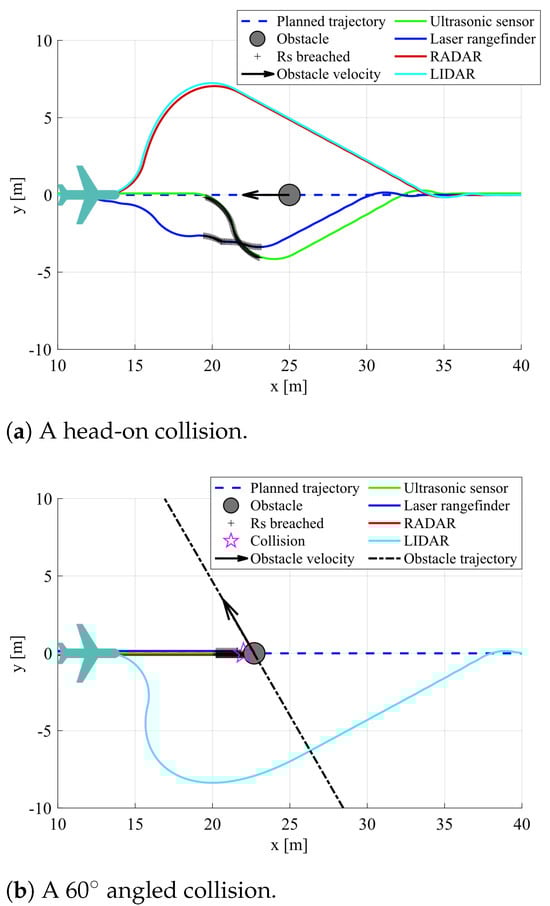 A similar test was made with the UAV set on a 60 angled collision course with an obstacle moving at a speed of 12 m/sm, as represented in Figure 9b. In this case, only the LIDAR sensor was able to properly track and execute the evasion maneuver, without ever breaching the safety radius, in a timely manner. All other sensors were unable to track the obstacle in a timely manner due to their reduced range or FOV, thus leading to a collision.