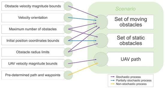 Different bounds were defined regarding the kinematic and dimensional properties of the obstacles and the UAV itself. Various stochastic and partially stochastic processes were then extracted from these intervals, creating random values for the different variables, as depicted in Figure 10. Partially stochastic processes were used in two different cases: determining the velocity orientation of moving obstacles and setting the position of static obstacles. In the former, the goal was to ensure that, initially, the direction of the obstacle’s velocity should point to the center of the domain rather than pointing outward, thus increasing the possibility of collision. In the latter, the position of any static obstacle must not be within a determined safety radius around the waypoint given that the UAV must pass through it. All remaining bounds but one were used to select a completely random value that ultimately defined each set of obstacles. In addition, a pre-determined flight path was loaded, which accounted for a non-stochastic process, into each scenario.