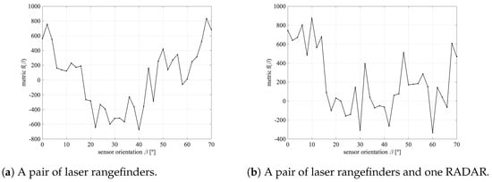 The deceptive look of the metric function defined in Equation (11), might suggest that least-squares or quadratic programming methods would be adequate. However, the metric is far from satisfying the required properties since the terms vary in a highly non-linear fashion with variable . Figure 12 shows the metric function value defined in Equation (11) for two particular sensor sets: (i) using only a pair of laser rangefinders with a 100 m range that symmetrically pointing forward with an angle with respect to the UAV longitudinal axis; and (ii) adding a RADAR with a 120 m range pointing in the direction of the UAV longitudinal axis. In both cases, the metric function proved to be multimodal and noisy.