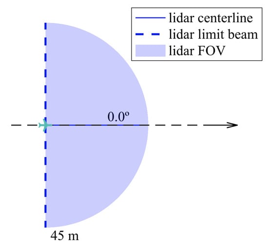Each LIDAR was modeled with a range of 45 m, an accuracy of 0.1 m, and a variable FOV. According to hardware specifications (see Table 1), this FOV can range from to ; thus, a FOV of was chosen. This value ensures a reasonable trade-off between timely scanning frequency and a broad scope.