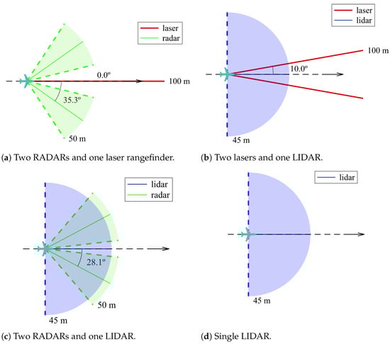 Other solutions that involved three sensors were optimized; for example, two laser rangefinders that were symmetrical about the UAV longitudinal axis and whose orientations were bonded between and , and one fixed RADAR pointing forward. This configuration was also replicated with two lasers and one LIDAR; two RADARs and one laser; and two RADARs and one LIDAR. The performance of the optimal version of these sets of sensors, as well as the results from the solutions with only one type of sensor that are discussed in the previous subsections, is summarized in Table 3. Optimizations with different sets of sensors were performed but left out of this table in order to avoid redundancy in the results.