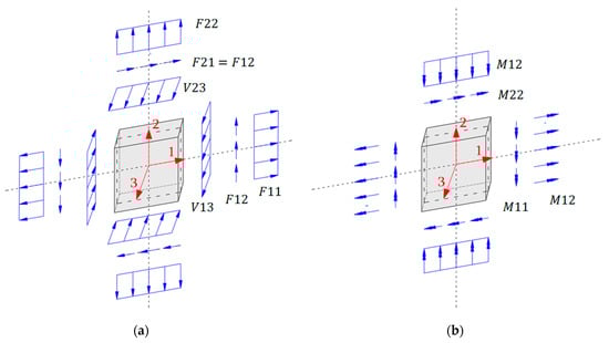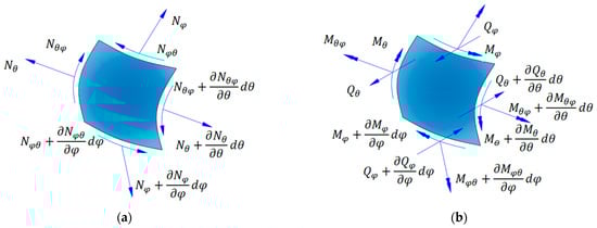 Figure 3 depicts the forces and moments which develop according to the membrane and bending theory of shells [26]. The forces , and form the basis of the membrane theory. The moments , and in combination with the transverse shear forces and , form the basis of the bending theory.