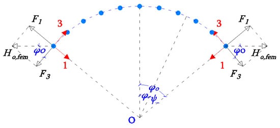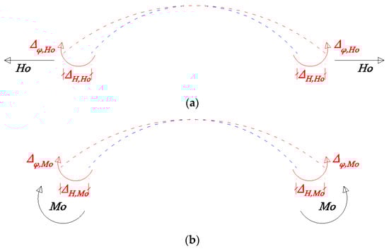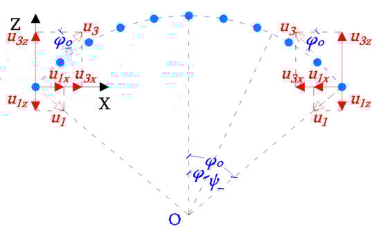 Two cases of edge conditions along the dome’s perimeter are taken into account: (i) base force, ; (ii) base moment, (Figure 4). The edge force, causes the horizontal translation and the rotation of the base. Furthermore, the edge moment, , causes the horizontal translation and the rotation of the base.