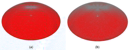 In order to investigate the discretization effects on the numerical results, two different schemes were formulated: (i) coarse and (ii) dense mesh. Specifically, in the case of the coarse mesh discretization, the perimeter of the spherical cap of radius, , is divided into sections corresponding to an angle of 2°, while in the case of the dense mesh discretization, the aforementioned angle receives a value of 1°. Both discretization schemes lead to a high concentration of strains and stresses at the top of the spherical dome due to the high number of meridians that pass through. However, taking into account that the loading is not applied at the top but at the edges of the truncated spherical dome, and that the target is the estimation of the base displacements, the discretization effects at the top of the dome are considered to be not only local but negligible as well. In the case that the loading passes through the top of the dome, such as gravitational loading, or is applied exactly at the aforementioned point, as a concentrated force/moment, then the engineer should seek a different discretization scheme that lacks a node at this geometrical point. Furthermore, in order to achieve the optimum stress distribution, the mesh should be characterized by symmetry. Figure 6 depicts the two mesh formulations, which correspond to a spherical dome of a roll-down angle, 40°.