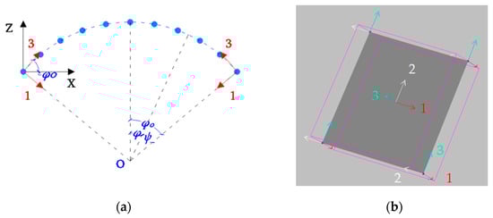 Figure 9 depicts the deformation of a typical shell element that belongs to the perimeter/base of the truncated spherical dome under the application of horizontal edge force, and edge moment, . Under both types of loading, the base points translate along local axes 1 and 3 and rotate about local axis 2.