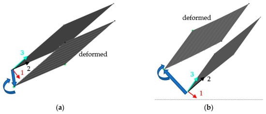 The terms and correspond to the rotational displacement caused by the horizontal edge force, and edge moment, , respectively. Therefore, in the framework of the finite element method, the aforementioned rotational displacements correspond to the rotation of the base joints around local axis 2, according to the loading definition. Furthermore, the terms and correspond to the horizontal displacement caused by the horizontal edge force, and edge moment, , respectively. Hence, the translational joint displacements along local axes 1 and 3 must be analyzed along global coordinate axes X and Z, in order to determine the horizontal displacement (Figure 10).