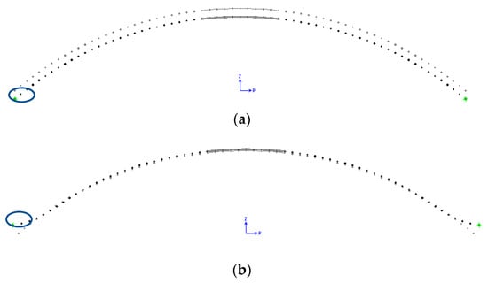 Figure 11 depicts the typical deformation of a cross-section of the truncated spherical dome under the action of both types of loading. The grey dots represent the initial position of the finite element nodes, while the black dots represent the final deformed shape, after the application of loading. The horizontal edge force, , affects the deformed shape of the spherical dome in total, while in the case of the edge moment, the deformation is more locally pronounced near the edge. Due to the symmetry of the loading and the structural geometry, as well, the results of the numerical analyses, either in terms of stresses or displacements, at any cross-section in the -Z plane, are the same. Therefore, only the base displacements of the point which belongs to Χ = , Z = 0, and are extruded from the results’ data base.