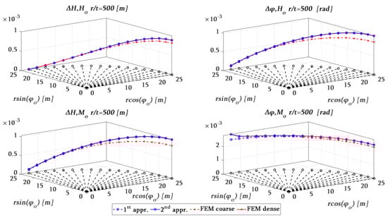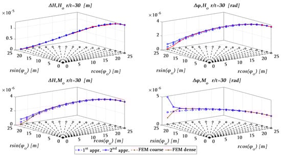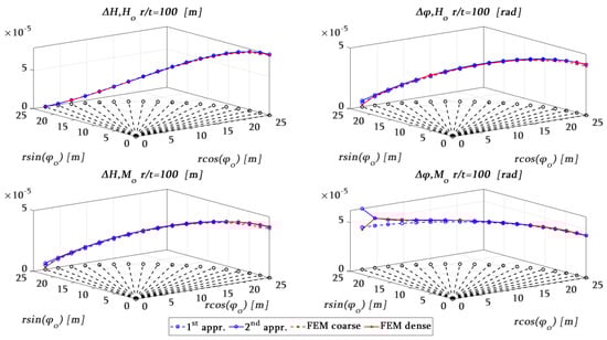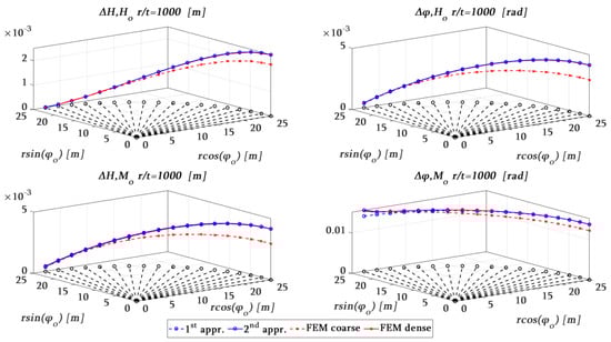 Figure 12 depicts the results of a very thin shell, which is characterized by 1000. The two analytical approaches coincide, except in the case of the rotational displacement due to edge moment loading, and for small values of roll-down angles. The aforementioned difference is attributed to the dependence of the rotation on trigonometric terms of the roll-down angle, according to the second theoretical approach. The existence of the trigonometric term (Equation (13a)), in the denominator of (Equation (13f)), alters the analytical results for small values of . Furthermore, the difference between the coarse and dense finite element formulation is obvious for large numbers of roll-down angles for all degrees of freedom and under both loading cases. On the contrary, for small values of roll-down angles, the coarse discretization scheme suffices and converges to the second theoretical approach. The aforementioned can be explained by the fact that at small values of , the radius of the spherical cap, and consequently, the perimeter of the spherical cap, receives small values. Therefore, taking into account the small thickness, , the selection of the discretization at 1° or 2° angles is meaningless.