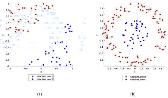 In this section, a visual example of the application of ANNs to solving a classification problem is presented. The purpose of this section is to illustrate how the inclusion of quadratic or other nonlinear functions of the input training data into the training dataset can make the ANN more robust and accurate. Two simple classification problems containing random points in a plane are shown in Figure 1, where the first problem, shown in Figure 1a, is a linear classification problem and the second problem, shown in Figure 1b, is a nonlinear classification problem. Both classification problems involve two different groups of points, labeled “class 0” and “class 1”, in different configurations. In the case of linear classification problems, the separation between the two point groups can be performed with a straight line (or hyperplane in higher dimensions). In the case of nonlinear classification problems, this separation is not possible with a straight line or hyperplane. It is obvious that there is no line that can separate the two point groups in Figure 1b; therefore, any linear regression procedure that could resolve the problem in the linear case cannot work in the nonlinear case, where the application of ANNs or other AI methods for the classification is imperative.