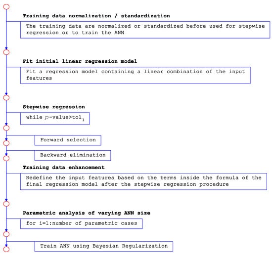 The present study explores a new approach towards minimizing the size of the hidden layer of regression ANNs in an effort to minimize the computational effort required for their training while maximizing their prediction accuracy. For this purpose, quadratic and cross-product terms of the input parameters are considered additional predictors in the input layer of the ANN. This addition is performed sequentially by using a SR algorithm, which adds or removes the most or least relevant, respectively, from these additional predictors to or from an initial linear regression model based on the statistical criterion of the p value of the F-statistic [17,18]. Thus, in each step, the statistically better of the two regression models (the current model or the model after the addition or removal of the candidate predictor variable) is kept. The SR procedure offers an efficient automatic search procedure that proceeds sequentially, thus avoiding the large computational load associated with other predictor search procedures (e.g., the best subsets algorithm) in cases of a large number of predictor variables [19]. SR avoids the need for the inclusion of all possible quadratic combinations of inputs which would be clearly infeasible [20]. Also, it gives a definitive answer and does not rely on arbitrary interpretations from the user. An F-test follows an F-distribution and can be used to compare statistical models. The additional quadratic terms are taken into account as additional features in the input training data and thus increase the size of the input layer of the ANN. However, the effect of increasing the input layer on the complexity of the ANN is offset by the reduction in the required size of its hidden layer. It is proven in this study that application of the SR-ANN algorithm not only reduces the required size of the ANN but also reduces the prediction error of the modified ANN (which has its hidden layer size optimized).