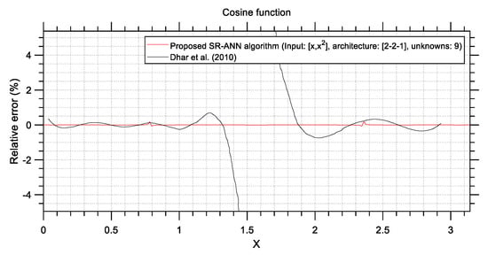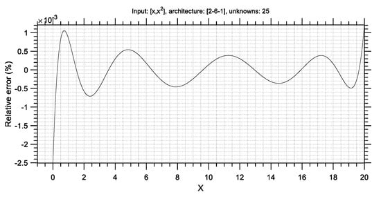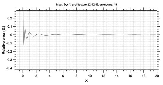 Relative error of ANN with optimum architecture for the approximation of the function , according to the proposed SR-ANN algorithm.