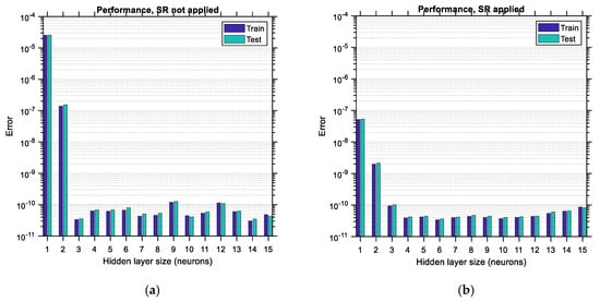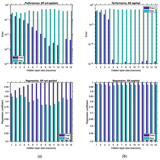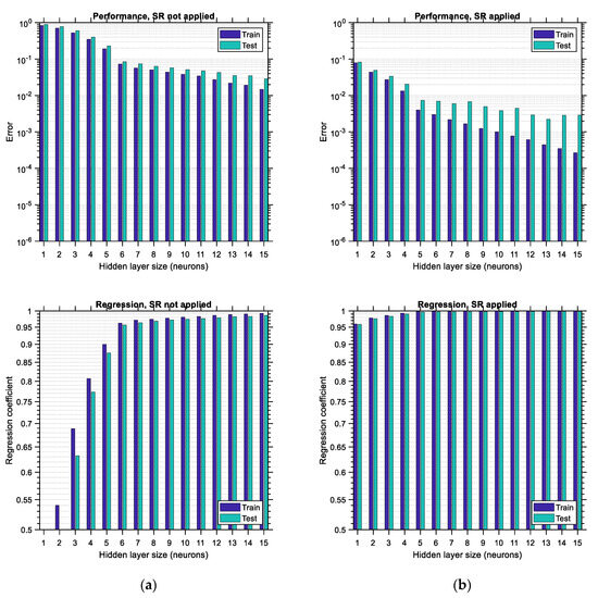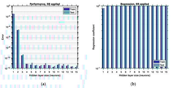 The performance error and regression coefficient between the predicted and actual output data are shown in Figure 16 for the case of data distributed according to the LHS algorithm. Each bar corresponds to one size of the hidden layer of the ANN (i.e., the number of its neurons). In the horizontal axis, the hidden layer size ranges between 1 and , where is considered to be equal to 15. The upper limit of this range is arbitrarily selected so that the various trends are adequately illustrated in this study; it could be extended to higher values as well. Each bar is comprised of two sub-bars, the left of which accounts for the training error/regression and the right of which accounts for the testing error/regression. The vertical axis is set to be in logarithmic scale so that the various differences between the plots become more obvious. By comparing the corresponding bar charts between the case where SR is not applied (i.e., BR-ANNs trained according to usual procedure) and the case where the SR procedure is applied as suggested in this study, it becomes apparent, by comparing Figure 16a,b, top and bottom, respectively, that in the latter case the testing error is reduced and also the regression of the testing data is increased. The reduction in the performance error can reach as much as 90%, whereas the improvement in the regression is of lower magnitude, especially for hidden layer sizes larger than four. This implies that the application of the SR technique leads to more accurate ANNs by roughly one order of magnitude. Furthermore, it should be observed that as the size of the hidden layer increases, the training error decreases. The same does not happen with the testing error, which, depending on whether SR is applied or not, either shows a local minimum or decreases continuously, respectively, at least for the range of the hidden layer size considered. Such local minima do not occur (and should not) for the training data since, after the hidden layer size exceeds a certain limit, overfitting occurs in the ANN involved, and as a result, the training error is supposed to continue decreasing while the testing error is supposed to start increasing. This trend is in total agreement with the trends observed in the bar charts (see Figure 16b, Figure 17b and Figure 18b, top). The minimum testing error occurs for hidden layer sizes equal to 14 and when SR is applied for the LHS-distributed data case (as noted in Figure 16b, top). In addition to the above, it is apparent that applying the SR technique leads to higher values of regression as well, especially for lower sizes of the hidden layer.