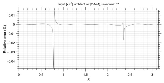 In Figure 10, the relative error of the ANN with the optimum architecture according to the SR-ANN algorithm is shown. The maximum error is about 0.4%, a value that is a little lower than that of [29]. However, the architectures of the ANNs are substantially different, where the ANN in [29] has 20 hidden nodes whereas the ANN involved in Figure 10 has 12 nodes. This fact has certain implications regarding the required computational effort to train the two ANNs. It is therefore shown that the proposed SR-ANN algorithm can lead to computationally lighter ANNs, achieving roughly the same accuracy as the ANN trained with ordinary methods.