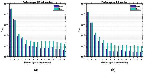 Training and testing performance MSE error of BR-ANN for varying sizes of its hidden layer for approximating the gamma function: (a) SR is not applied; (b) SR is applied.