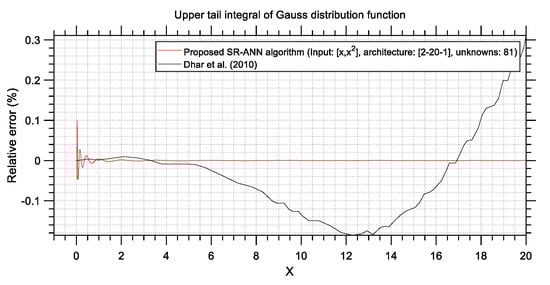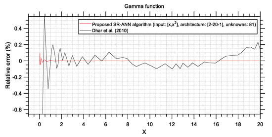In reference [29], the ANN is considered to have 20 hidden neurons. This case has also been solved with the proposed SR-ANN algorithm. The relative error of the ANNs for the approximation of the gamma function as described above is shown in Figure 9. It is obvious that the proposed SR-ANN algorithm results in an ANN with superior accuracy since the maximum relative error according to [29] is about 0.65%, whereas according to the proposed SR-ANN algorithm it is about 0.1% (approximately 6.5× lower) as shown in Figure 9.