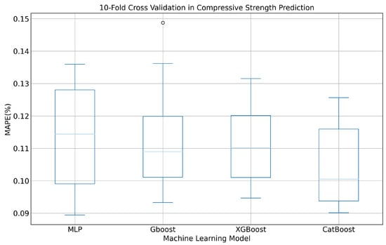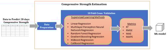 - Various machine learning models were evaluated to estimate compressive strength. The best prediction performance was obtained by the CatBoost regression algorithm, which achieved superior performance for all error metrics and consistency in its predictions. The model demonstrated strong generalization capabilities, with minimal disparities between the training and test set errors, thus indicating that it was not overfitted.
