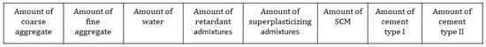 - The fractions within the quality constraints specified by (2) are dimensionless fractions within the range , with 0 indicating perfect adherence to the constraint. These constraints include the target , the water–cement ratio, and the proportion of fine aggregates to the total aggregates.