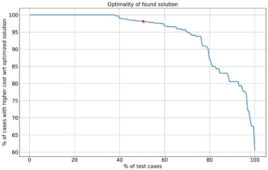 - The cost of was ranked along all samples in K in descending order of cost. A ranking of indicates that has the lowest cost among all samples in K, while a ranking of signifies that has the highest cost among the samples in K. This ranking served as an indicator of the optimality of solutions obtained by the optimization algorithm.