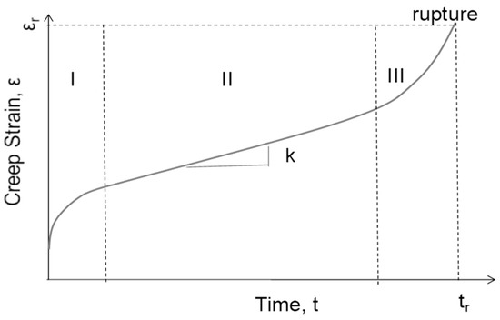 Creep deformation occurs in the homologous temperature range of 0.3–0.9 T/Tm, where T is the application temperature and Tm is the material’s melting temperature in degree Kelvin. It generally proceeds in three stages: (I) primary; (II) secondary, or the steady-state; and (III) tertiary stage, as schematically shown in Figure 1. In the primary stage, creep rate is decelerating; in the secondary stage it exhibits a nearly constant creep rate, which is often known as the minimum creep rate; and in the tertiary stage creep rate is accelerating to the point of rupture at last. Creep deformation can occur under stresses well below the material’s yield strength. Therefore, it is distinguished from rate-independent plasticity, even though both lead to permanent shape change. Basically, all creep phenomena such as creep strain, creep rate, creep life, and creep ductility are attributes of the creep curve (process). Metallurgical examinations using scanning electron microscopy (SEM) and transmission electron microscopy (TEM) on the microstructure and fracture surfaces of crept specimens are often performed to obtain information for understanding the mechanisms of creep deformation and fracture of the materials.