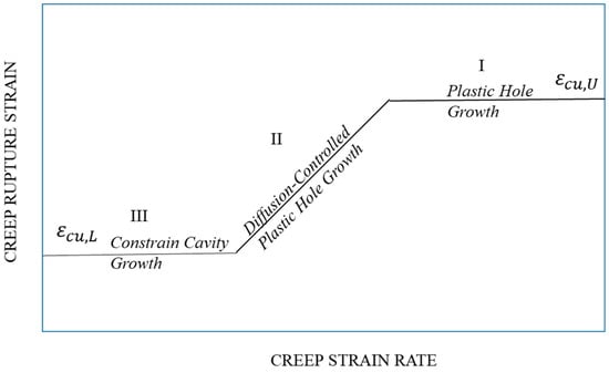 where εcu,L/U are the lower/upper shelf creep rupture strains, C1, n1, and m1 are material constants, Q* is related to diffusion activation energy. Holdsworth used Equation (9) to draw a schematic trending curve [20], as shown in Figure 2, and divided the curve into three regimes: regime I was plastic hole growth leading to ductile dimpled failure; regime II was diffusion-controlled cavity growth and creep ductility decreases with reducing strain rate; whereas in regime III cavity growth was constrained and creep ductility is independent of creep strain rate.
