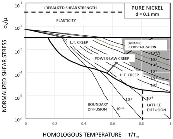 Frost and Ashby (1982) constructed deformation-mechanism maps for many metals [23], which graphically shows the regions of dominance of particular mechanisms in the stress–temperature field with the boundaries being defined by the line of equal contributions from both sides. An example of a deformation mechanism map for pure nickel is shown in Figure 3. Usually, IDC (power-law) creep is dominant in the high-temperature intermediate-stress region. As the stress increases, the exponential stress-dependence of creep rate is manifested, which is called power-law breakdown, meaning that deformation enters into the IDG region. Full discussions of deformation mechanism maps can be referred to Frost and Ashby (1982) for pure metals [21] and Wu (2019) for some engineering alloys [5].
