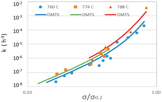 It can be inferred from Equation (19) that the creep rate would first drop from an initial value of k + / to a minimum value, and as the first exponential term diminishes to zero quickly, the creep rate increases exponentially with time when t > . In the tertiary stage, this relationship appears to be log-linear, so that both k and M* can be obtained by linear regression of the tertiary creep data. The absolute minimum creep rate k, which is actually very close to the conventional minimum creep rate, is plotted against σa in a log-log plot, from which the power-law proportional constant and exponent can be obtained for each mechanism. Creep data analysis consists of log-linear /log-log regression and Arrhenius analyses, as detailed in the book [5]. The absolute minimum creep rate vs. normalized stress relationship is shown in Figure 4, and the creep curves predicted by Equation (17) are shown in Figure 5, respectively, in comparison with experimental data for Haynes® 282TM.