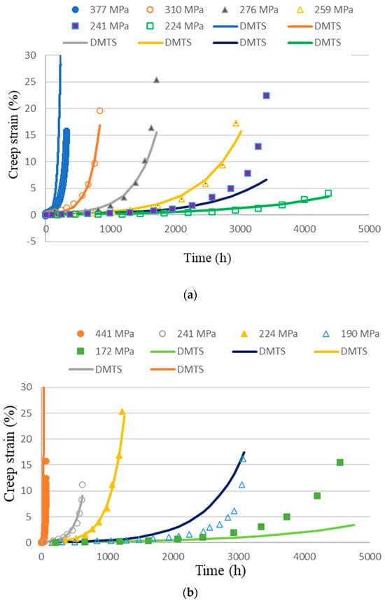 Predicted creep curves of Haynes® 282TM by the DMTS model in comparison with experimental data at (a) 760 °C and (b) 788 °C [51].