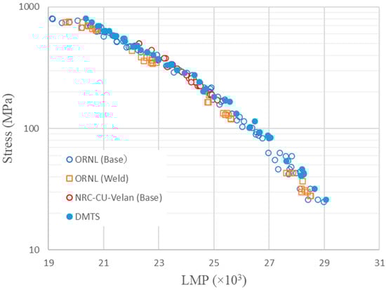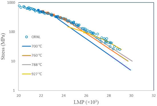 Using the LMP, the creep strength can be determined from σ-LMP correlation (usually, a polynomial fit). The LMP offers a method to predict creep life assuming that the σ-LMP correlation is a master curve for the material. It implies that short-term data obtained at higher temperatures can be used to predict long-term creep life at lower temperatures, if the LMP of the two conditions is the same. However, due to the scatter in experimental lives, the uniqueness of Equation (3) has never been proven. In addition, the LM method has inherent ambiguities relating to physical mechanisms. Thus, the reliability of the LMP method is still in question. Nevertheless, this method is popularly adopted in creep design, perhaps because of its straightforwardness, as long as enough data are generated to cover the LMP range of application.