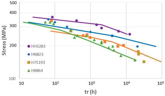 An example of microstructural effect on creep can be found for Alloy 800. A series of Alloy 800 were made with the high/low carbon content and increasing Ti + Al content in ascending order from HB647, 75193, and HN823 to HH3283 [59]. The mechanism parameters for the creep rate in different batches of Alloy 800 at 550 °C are given in Table 1 [50], which are determined to match the minimum creep rate as a function of stress, as shown in Figure 9. The trend of increasing the power-law exponent for the IDG mechanism is consistent with the trend of increasing the Ti + Al content that enables the intragranular γ’ precipitate strengthening mechanism. GBS is assumed to be the same for the high C content alloys, 75193, HN823, and HH3283, with abundant grain boundary Cr23C6 precipitates, while HB647 has a lower resistance to GBS due to its much less C content than the other batches. In these alloys, Ti and Al would have little contribution to GBS, because they do not participate in grain boundary precipitation. The impact of microstructural variation on the rupture life for Alloy 800 is shown in Figure 10. IDG is responsible for intragranular deformation instability (necking) () and GBS causes intergranular fracture ().
