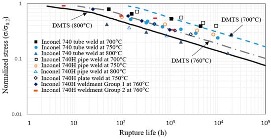 Creep life predictions of the DMTS model for Inconel 740H weldment at different temperatures in comparison with experimental data and the creep lives of similar materials [61].
