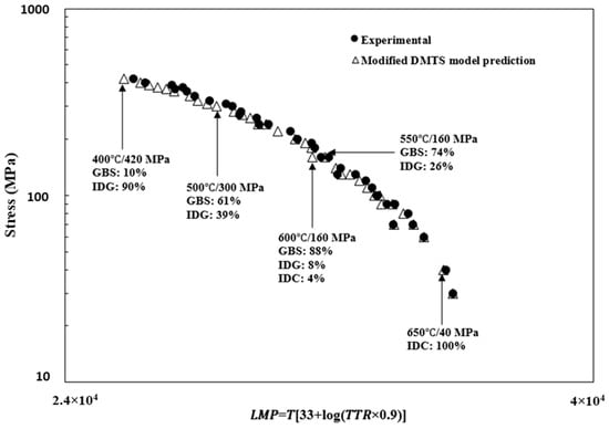 The DMTS model-predicted creep lives of Haynes® 282TM are shown in Figure 7 in comparison with the creep rupture data from Oak Ridge National Laboratory (ORNL) [54] and the National Research Council Canada-Carleton University-Velan collaboration (NRC-CU-Velan) [51]. The DMTS model predictions were made corresponding to each test condition, using the mechanism parameter values given in [51]. First of all, the independent tests proved the observed behavior to be true. Second, the DMTS model predictions agree very well with the experimental data in terms of LMP with CLM = 20. A very high coefficient of determination (R2 = 0.98) is obtained between the DMTS model and the experimental LMP. Unlike the irrelevance of LMP to the underlying mechanisms, the DMTS model carries the mechanism-partitioning information, which is insightful for further discussion.