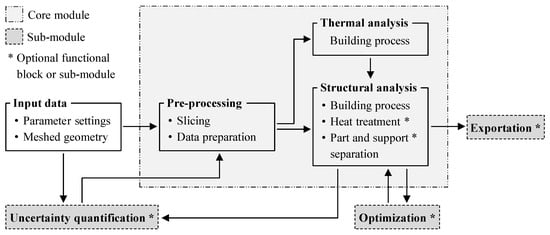 Within the thermo-mechanical simulation tool AscentAM, the fundamental phases of the PBF-LB/M process are represented to predict the residual stress states and the resulting part deformation. The structural layout of the process simulation is depicted in Figure 1, where the core module is shown with its functional blocks. The sub-modules represent optional extensions to the process simulation. The processing of the simulation data is performed using a Python3 routine. The numerical solution is provided by the open-source FE software CalculiX CrunchiX (CCX) [], which can be extended by user-defined subroutines.