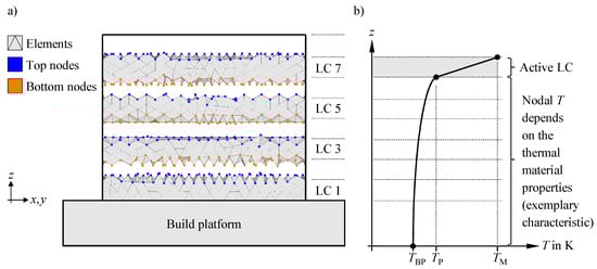 During the heating step, a flash exposure heat source with a linear temperature gradient is applied due to its computational efficiency. The corresponding temperatures are illustrated in Figure 2b for the currently activated LC. The temperature load is provided by a CCX user-defined subroutine, which imposes a temperature boundary condition for all nodes of the topmost active LC at once. The temperature in the z-direction is determined based on the position of the nodes within the currently heated LC. The temperature gradient over the LC height L results from the melting temperature at the topmost nodes and the process temperature , representing the temperature in the heat-affected zone at the bottom nodes in the respective LC. An extrapolation of this linear temperature gradient to nodes outside this LC is not performed. Underneath the active LC, the temperatures are calculated depending on the material properties. The temperature is applied to the bottom nodes of the build platform as a boundary condition.