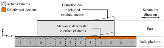 The final step within the structural analysis is the separation of the part and the support structure from the build platform. In reality, the part can be separated by sawing or electrical discharge machining (EDM). To model this separation mechanism after the desired manufacturing phase, the FEs of the build platform are removed successively along the separation direction. For this, the element death method [] is used. The separation can be divided into a user-defined number of sequential computational steps to simulate the process-specific separation speed. To prevent a rigid-body displacement of the part after a complete separation from the build platform, a statistically determined fixation is applied to the part. As depicted in Figure 3, this procedure allows for the local and temporal calculation of the residual stress release, which results in an additional part distortion.