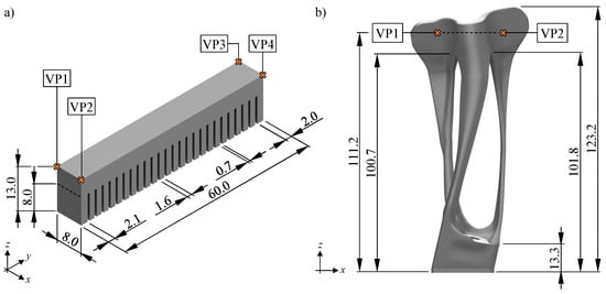 True-to-scale representation of (a) the academic cantilever beam and (b) the topology-optimized bracket geometry with the marked verification points (VPs), each used for the mesh convergence study; dimensions in mm; z: build direction.