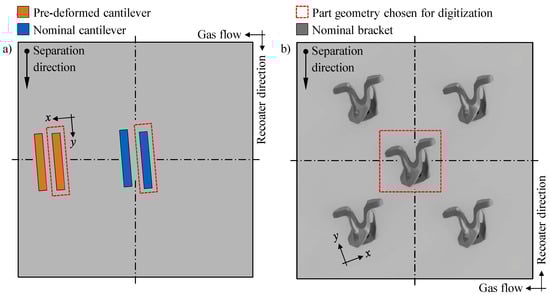 True-to-scale top view of the build platforms indicating the positions of (a) the cantilever beams and (b) the brackets; exemplary representation of the local coordinate systems for each of the parts placed on the respective build platform (250 × 250 mm2).