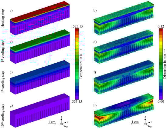 The verification of the applied linear temperature gradient from the flash exposure during the heating step is performed exemplarily for the cantilever beam. The simulated temperature fields and the corresponding mechanical results of the cantilever beam are shown for selected computational steps of the last LC in Figure 6.