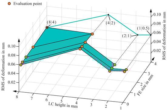 The results of the convergence study for the cantilever geometry are illustrated in Figure 7. Each evaluation point contributes to the formation of the 3D surface. As shown by the 3D surface, at each LC evaluation, the FE size alterations did not have a strong influence on the RMS of the deformation. This is indicated by almost horizontal curves, which show a maximum deviation of 6%, along the axis representing the FE size. Along the LC height axis, however, clear changes in the analyzed values are evident. Therefore, selected evaluation points, which fulfill the condition of the LC height being twice as large as the FE size, are projected onto the backplane to highlight the influence of the LC height changes.