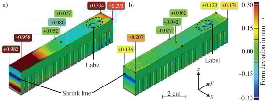 For the cantilever beam, the determined form deviation with and without applying the pre-deformation algorithm is depicted in Figure 8. The non-pre-deformed manufactured geometry in Figure 8a shows a strong one-sided distortion, which decreases in the direction of the separation process (see Figure 5). This distortion results from a bending in the positive z-direction of the part geometry due to the residual stresses released during the separation of the cantilever from the build platform []. The pre-deformed manufactured geometry showed a significantly increased dimensional accuracy after the separation. The largest deviations were determined at the contour regions. This is caused by the flash exposure heat source applying a linear temperature gradient, which does not consider the increased energy volume density in the contour areas during the PBF-LB/M process. To represent this effect, the different PBF-LB/M scanning strategies need to be modeled at the real layer level [], which would in turn lead to a significantly increased computational effort. At the height of the structural transition, a shrink line formed, the investigation of which is subject of ongoing research [].