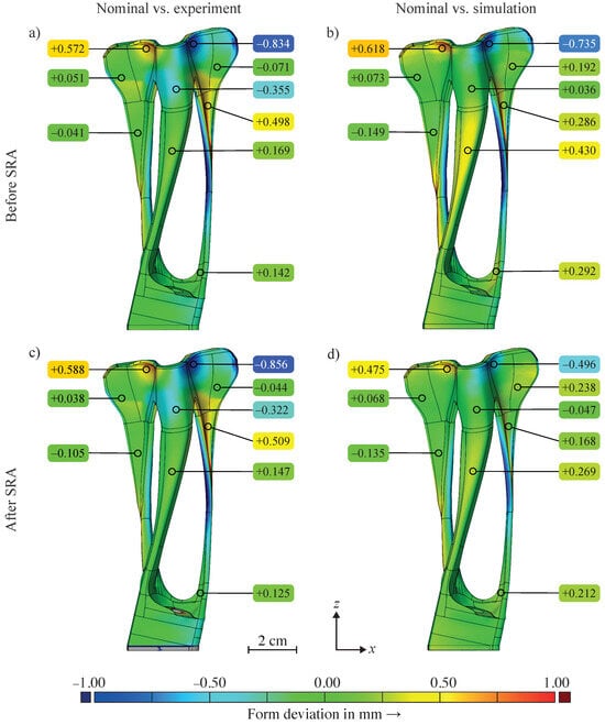 For the topology-optimized bracket, the determined form deviation before the SRA, and after the SRA and separation from the build platform are shown in Figure 9. For these two manufacturing states, the as-built part and the simulated result are each compared with the nominal geometry.