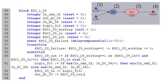 The component models used in this study are illustrated by an ESC model created in System Analyst 1.3, as shown in Figure 2 The corresponding AltaRica 3.0 code is also provided in Figure 2. This model includes a state variable (ESC1_29_working, line 53), and eight flow variables: external inputs from the flight controller command (In_cmd_32, line 49) and battery DC power supply (In_DC_34, line 51), an external output to the motor (Out_AC_33, line 50), internal input (ESC1_29_in, line 54) and output (ESC1_29_out, line 55), and a logic operator variable (Logic_310, line 52).