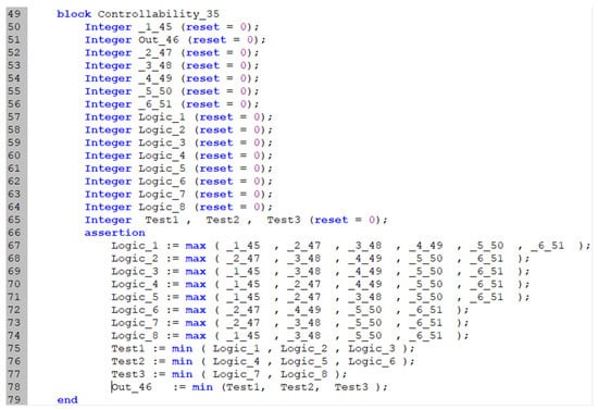 Once the MATLAB script completes the controllability analysis, as described in Section 2.3, it edits the AltaRica 3.0 code of the system model generated using the method in Section 2.2. Specifically, to populate the assertion of the controllability block, each row of the controllability assessment matrix is converted into logic flow variables and logical instructions. These instructions evaluate the input from each propulsor to determine whether each controllable failure case is true or not using an AND operator, represented by the maximum function. If a controllable failure case is true, the associated logic flow variable is set to 0; otherwise, it is set to 6. The assessments are then combined using an OR operator, represented by the minimum function: if any controllable case is true, the UAV controllability variable is set to 0 (working); otherwise, it is set to 6 (failed) before being communicated to the observer. An example of an edited controllability block model in AltaRica 3.0 for a hexarotor PPNNPN configuration is shown in Figure 3.