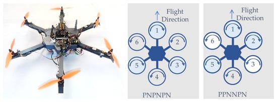 Hexarotor case study photograph (left) extracted from [], PNPNPN-configuration (center), and PPNNPP-configuration (right). The “P” designation represents rotors rotating clockwise, while “N” designates rotors rotating counterclockwise.