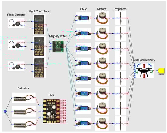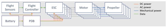 In this study, we consider a simplified power, propulsion, and control system for multirotor UAVs, illustrated in Figure 5, which employs a simplex architecture—an architecture without redundancy. The components of this simplified architecture include: