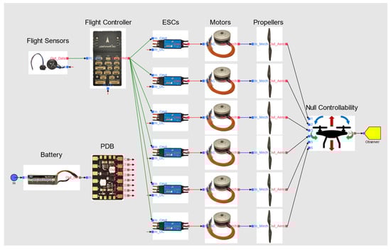 The integration of various system components, such as the ESC, to model the entire system replicates the conventional physical system architecture. Examples of these physical system architectures, modeled in System Analyst 1.3, are described in Section 4.3.1 and Section 4.3.6. Notably, the proposed modeling method includes a generic controllability model that links the control effectors to the flight control function, represented by an observer block, for analysis purposes.