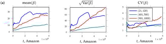 To depict the behavior of the sample coefficient of variation, we generate BA networks independently using the non-linear PA mechanism. The networks’ growth was restricted by 160,000 nodes. We took the number of attached links as , and we used three values of parameter as well as (for the BA model with LPA). The empirical values of the sample variation coefficients were calculated up to . The resulting trajectories for for nodes are present in the charts in the right parts of Figure 3a, Figure 3b, Figure 3c, and Figure 3d, respectively. The figures clearly show that the sample standard deviations of are less than the corresponding values of their means, and the dynamics of their ratio slowly tend to zero.