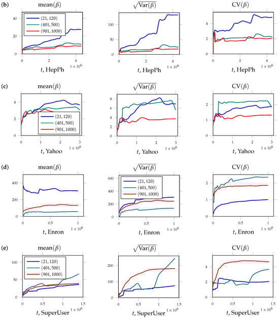 Real networks considered in Section 2 show similar behaviors, with an increase in the expected value over time and a rapid growth in sample variance. The coefficient of variation fluctuates and remains high within a certain range. However, networks generated using the Barabási–Albert model (Section 4) exhibit a different behavior, with a decrease in the expected value over time and a decrease in variance as well, which is inconsistent with real networks.