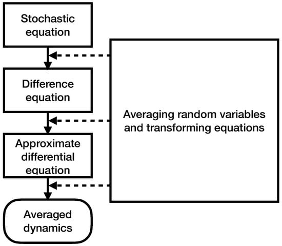 We first describe a methodology for finding the dynamics of based on the mean-field method (Figure 2). The first step is to obtain a relation, where the left side is the increment of the quantity of interest to us between neighboring times t and , and the right side contains the sum of the products of some random variables (see , below) and the corresponding outcomes of the quantity of interest calculated using , , , and . Thus, we obtain a stochastic equation. Then, we find the mathematical conditional expectations of both parts, provided that the network is in the state. We obtain a difference equation, which we will approximate using a differential equation. We usually obtain a first-order non-homogeneous linear differential equation, the solution of which can be found using the method of variation of parameters, which will describe the dynamics of the process of interest.
